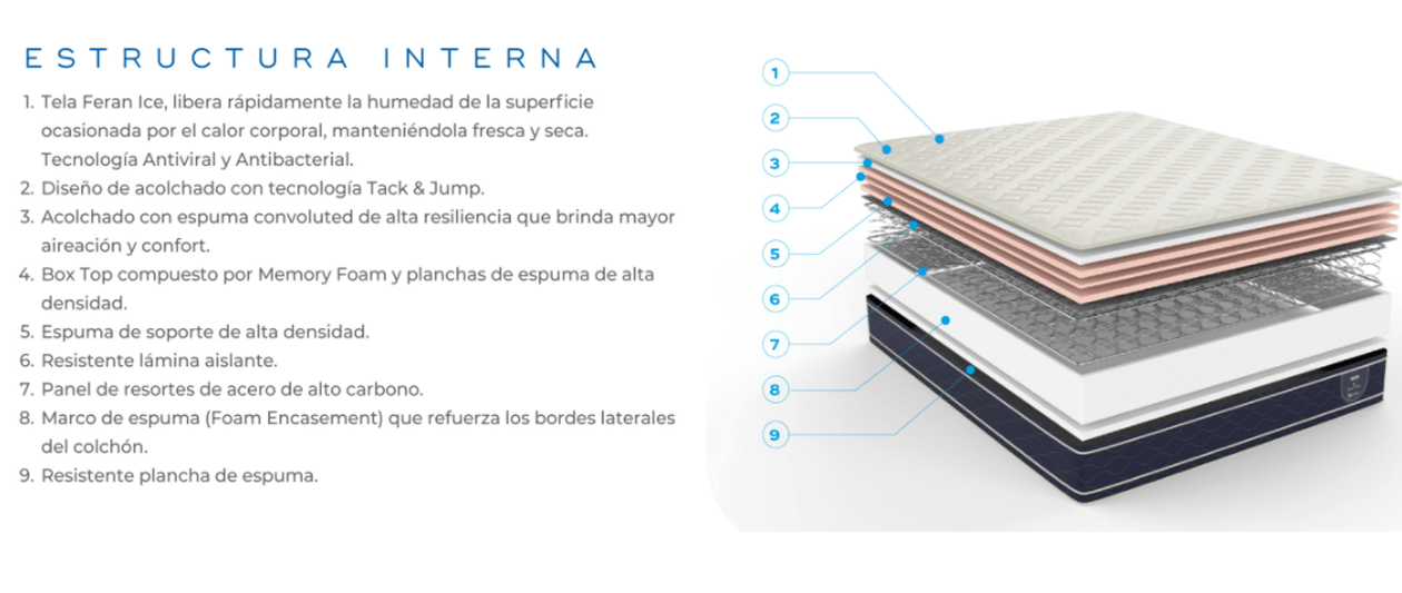 Sobrecapa reforzada con Memory Foam o látex que brinda confort, suavidad y adaptabilidad.